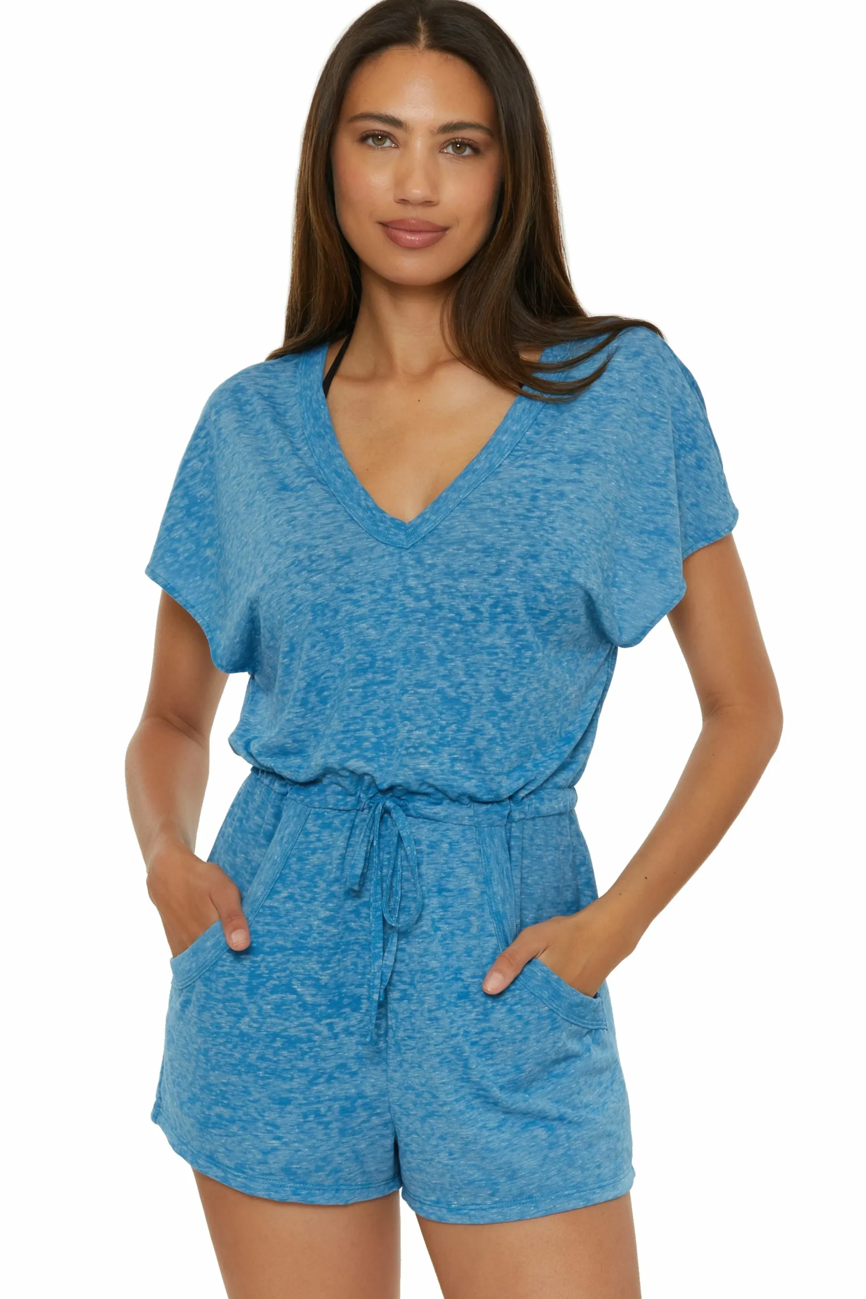 -Rib trim V neck pull on romper