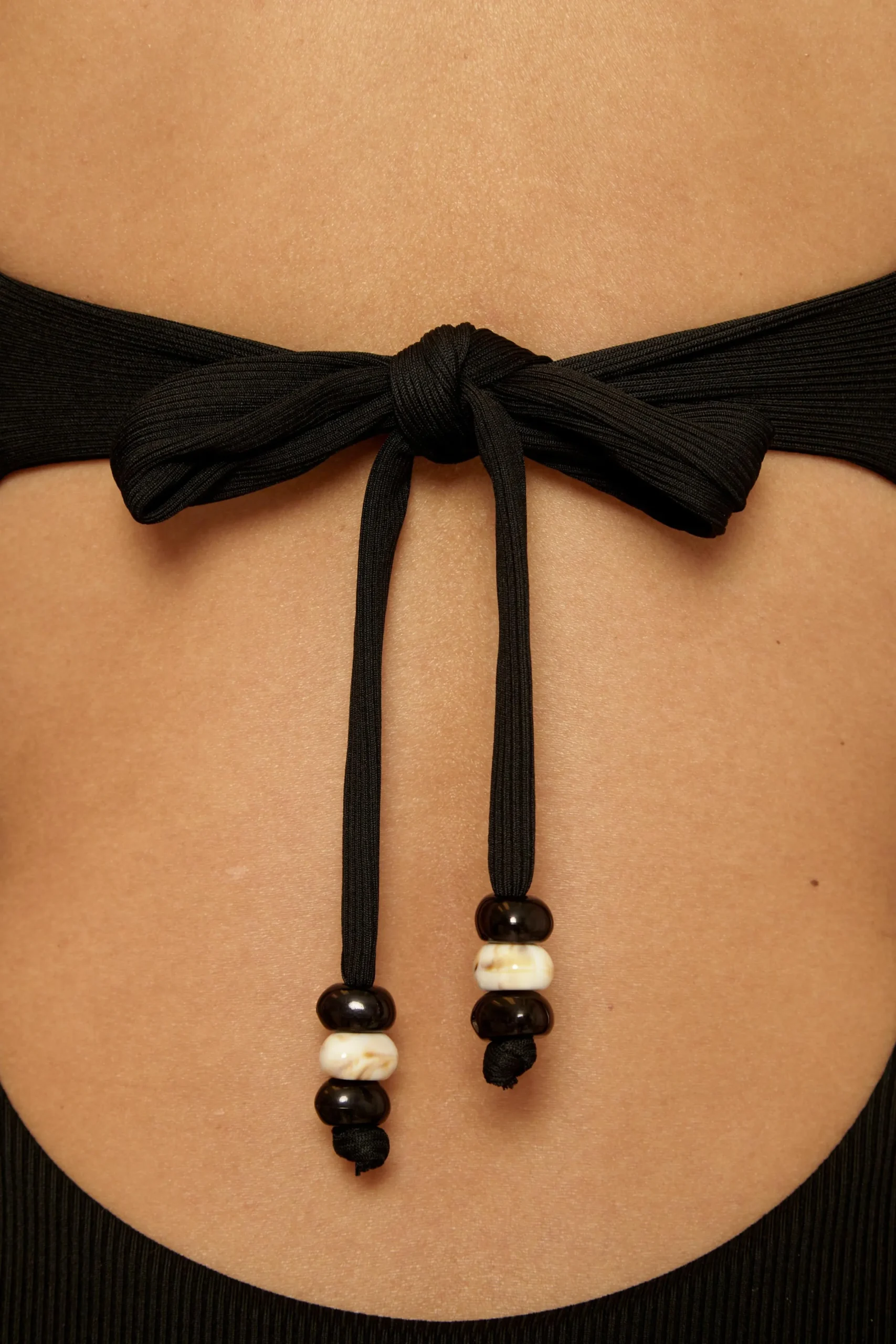 -Scoop back with stacked multi-colored beads on back ties